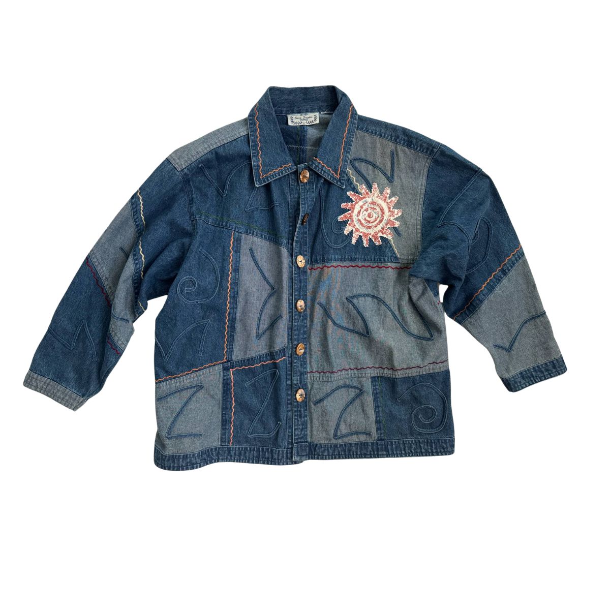 This vintage denim jacket brings a playful twist to your wardrobe with its vibrant Southwest patchwork. Each funky patch adds character and charm, making it a standout piece for casual days or creative nights.